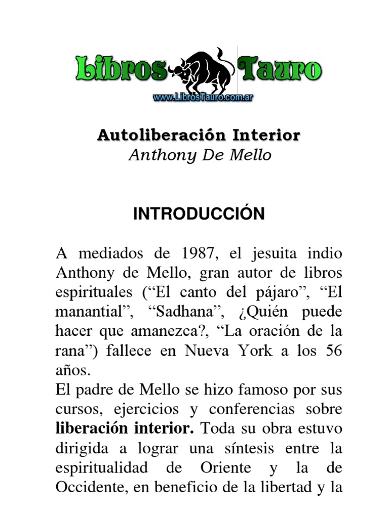 Destaco por su capacidad de conectar la religion cristina al budismo. Hernan para descargar de internet. His works are readily available and additional writings were published after his death. Anthony de mello autoliberacion interior.